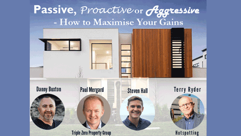 In this webinar Terry Ryder from Hotspotting and Danny Buxton, Paul Mergard and Steven Hall from the Triple Zero Property team, discussed how you can use different models of investing, be they passive, proactive or aggressive, to maximise your gains through property investing.